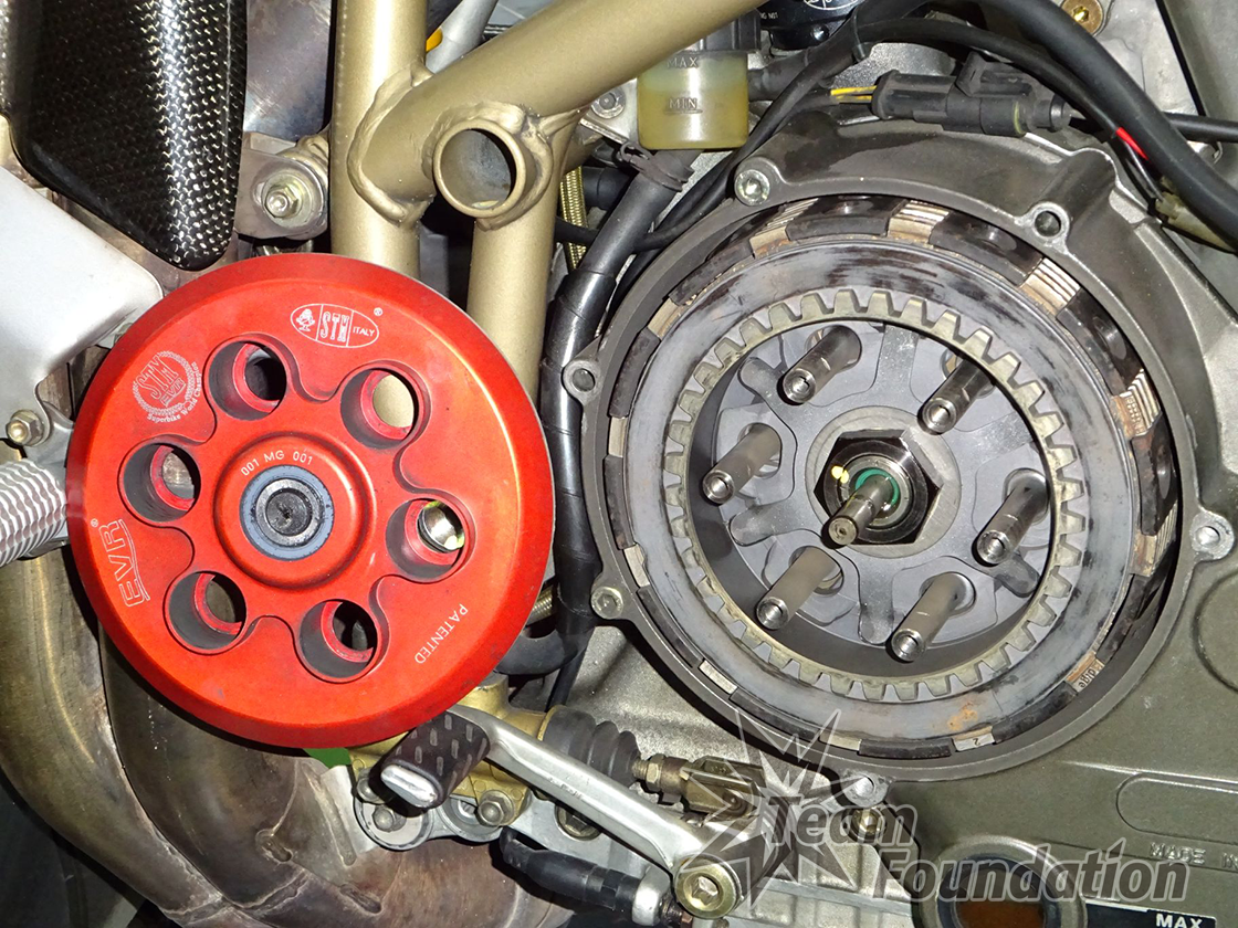 クラッチはDP製のスリッパークラッチが装着されています。クラッチハウジングはスチール製で穴あき軽量加工された916SPS純正の部品が付いています。