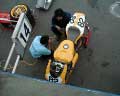 1周目1分18秒52、2周目1分15秒36、3周目13秒65.....。「あれ、もう13秒台じゃん。まじかよ。」私は思いました。コントロールタワーの上にあるリーダーボードのトップにゼッケン82が輝いています。あまりにもペースの上がるのが早すぎるので心配になったのですが、走りを見るとそんなに無理をしている様子も無いようです。走りに午前中までに見られたぎこちなさは有りません。しかしそれから何周か周回し、ワークスマシンを1コーナーのアウト側から抜いていったりして、タイムも1分9秒台に入ると、さすがにこのまま走らせておいてはまずいと思いました。サインボードを出していた西田氏にピットインのサインを出すよう指示したのですが、今度は小山がコントロールライン上を通過しない。「あちゃー、転んじゃったか....。」と思ったとき、ピットロードに入って来る小山の姿が見えました。