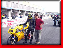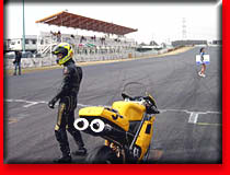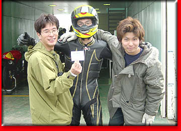 ★Rider's COMMENT★強風の為、決勝に出るのをやめて帰る準備をしていたのですが ”レース開催です!”という場内放送が流れて 観客らしき人に「もう出ないの?」と聞かれ、思わず私は「いやいや、出ますよ」と言ってしまったばかりにあの強風の中、ウォーマーを巻き準備を始めてしまった。そういえば何人か車にバイクを積んでしまっていた人がいたからもしかすると上位を狙えるかと・・・。グリットに着くと私の前のライダーが2人ほどいない・・・。 舩木さんの一言:「最低でも2位だね。」と私にプレッシャーをかける。 (↑↑↑やはりひどい人です) そしてレースは、砂煙りの上がる中行なわれました。 前の走っている車輌のタイヤからは砂煙りが上がる。パリダカを思い出してしまいました。スタートでホールショットをとれると思ったが、藤崎さんに先行されてしまいました。やはり藤崎さんは速い。どんどん離され、絶対届かないという所まではなされてしまったのですが、あっという間にバックマーカーが現れ、藤崎さんのラインを阻む。なんと、私は追い付いてしまいました。そして最終コーナー立ち上がりで横に並び1コーナーをインベタで入って行く。どうやら藤崎さんが1コーナーでミスをしたように見えた。そして後ろを一回も振り向くことなく、バックストレートへ。 なんと、1度左足首を折っているせいか疲労が出てシフトアップをうまく出来ない。失敗している間に、藤崎さんに抜かれてしまう。 なんとかして、抜こうとするがどんどん離れる。 1コーナーに入ったところでなんと藤崎さんがハイサイド。藤崎さんには悪いが、その時喜んでしまった。 まだ、後ろからマシンが来るかと思いペースを落とし過ぎない程度で確実に2周をして、チェッカー・・・・・・・。 生涯、オンロードでは初めての優勝である。 この天候の中で走ったからかなり疲労が出ている。1ヘア立ち上がりでウイリーを決めたかったのだがうまく行かなかった。2ヘア立ち上がりのウイリーもうまく行かなかった。 表彰台の前で何かやろうと思ったのだが、どうやら時間が押していて暫定表彰式はないのだ。悲しすぎる。 皆さんのおかげで優勝をすることが出来ました。 そして今考えれば、その観客の一人の「もう出ないの?」の一言がなければ決勝を走っていなかっただろうと思っています。