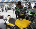 しばらくして、監督が到着。無事にバイクを運び終えたので、少々疲れ気味。(精神的にである.....)そこからピット裏のテントへ。なんと、そこには桜井ホンダのバイクとkawasakiのバイクがおいてあり.......さらにだっ!(力が入る)テントのなかで、そのkawasakiのバイクとファンデーションのドゥカティが並んで置いてあるではないか........ってそこまで運んだのはボクなんだけど(^-^; ちょ〜ドキドキっすよぉ〜 良いのかなぁ〜なんて思いながら・・・ドキドキ