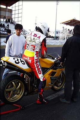 この後いよいよスタート。まぁまぁの出足3番手...そしてオープニングラップの最終コーナーをトップで立ち上がってきたのはこの黄色いDUCATIの岡田選手でした。その後2周目はGSX1300Rハヤブサを駆る新垣選手に抜かれて2番手から果敢にアタック。4周目に再びトップを奪い返し以後じわじわと後続との差を拡げていきました。7周目には新垣選手がシケインで転倒。その後は2位以下に5秒以上の差を付けて独走状態となりました。ベストタイムは1秒318。コースコンディション等を考えればよくやりました。 |
