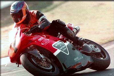 「名越さんに作ってもらったマシンは、恐ろしいほど速く身体がまだついていきません。体感速度で空冷2バルブSS系の3倍の速度感です。ブレーキは利きすぎて使い方がまったくわかりません。フルブレ−キング時にタンクの上に乗ってしまう程のストッピングパワー。写真を観ていただくとわかるのですが、バンクセンサーを全然擦っていません。この怖々乗った状態で筑波で1分4秒ハーフが出るマシンはスゴイとしか言い様がありません。はやく私も岡田選手の様に乗りこなしたいと思います。(一生無理かも知れませんが.....)カルチャーショック状態のフナキでした!!」